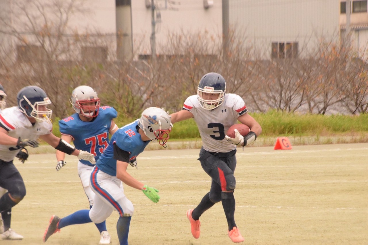 拮抗する時間帯が続いたが、慶應はOL陣の安定したブロックを軸に攻撃を立て直し、再びRB#3小泉(1年)のランで追加点を挙げる。続くプレーでも冷静に得点を重ね、リードを広げた(慶應15-埼玉医6)。前半を通してDB陣が相手WRを抑え、落ち着いた試合運びで後半へ折り返す。
