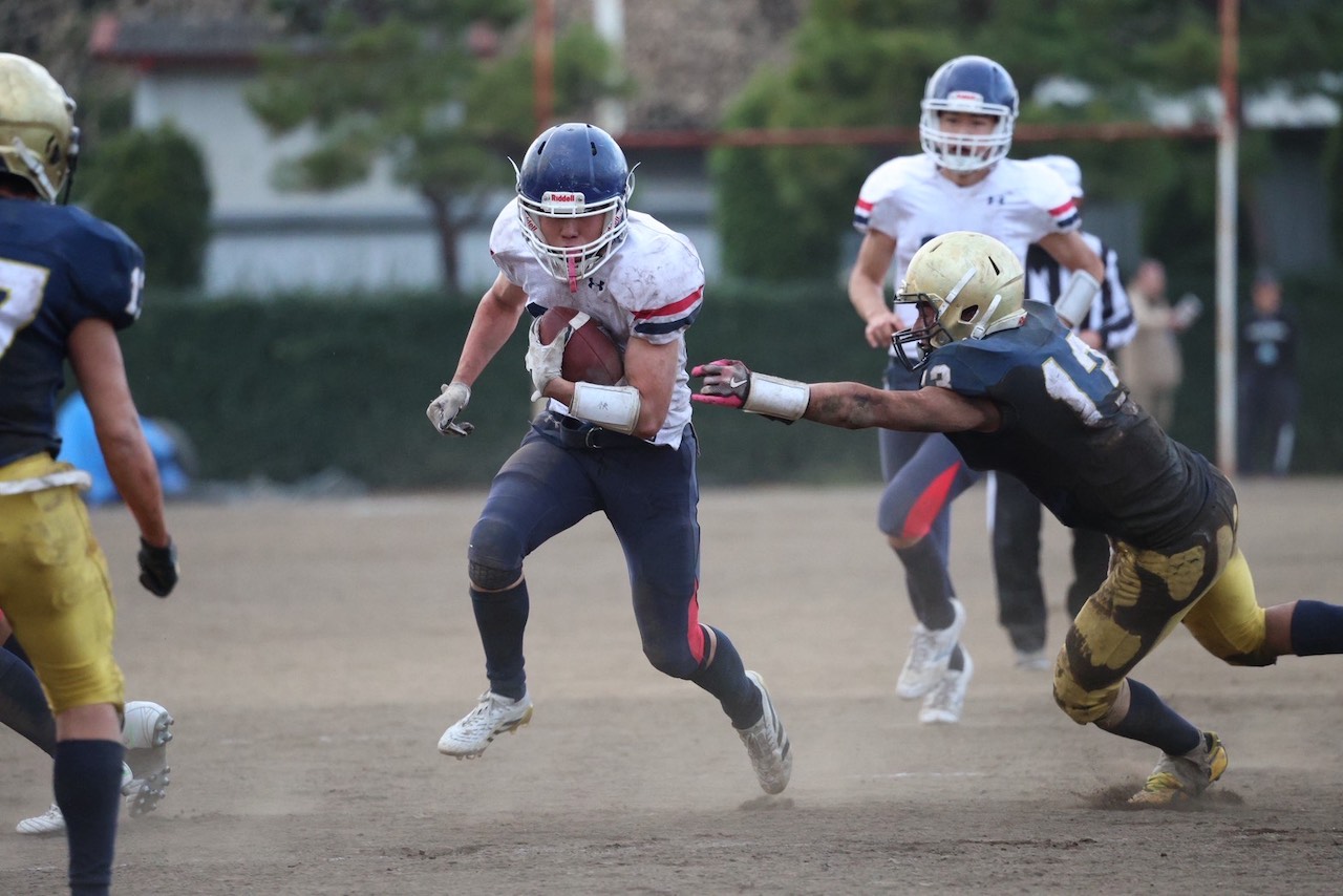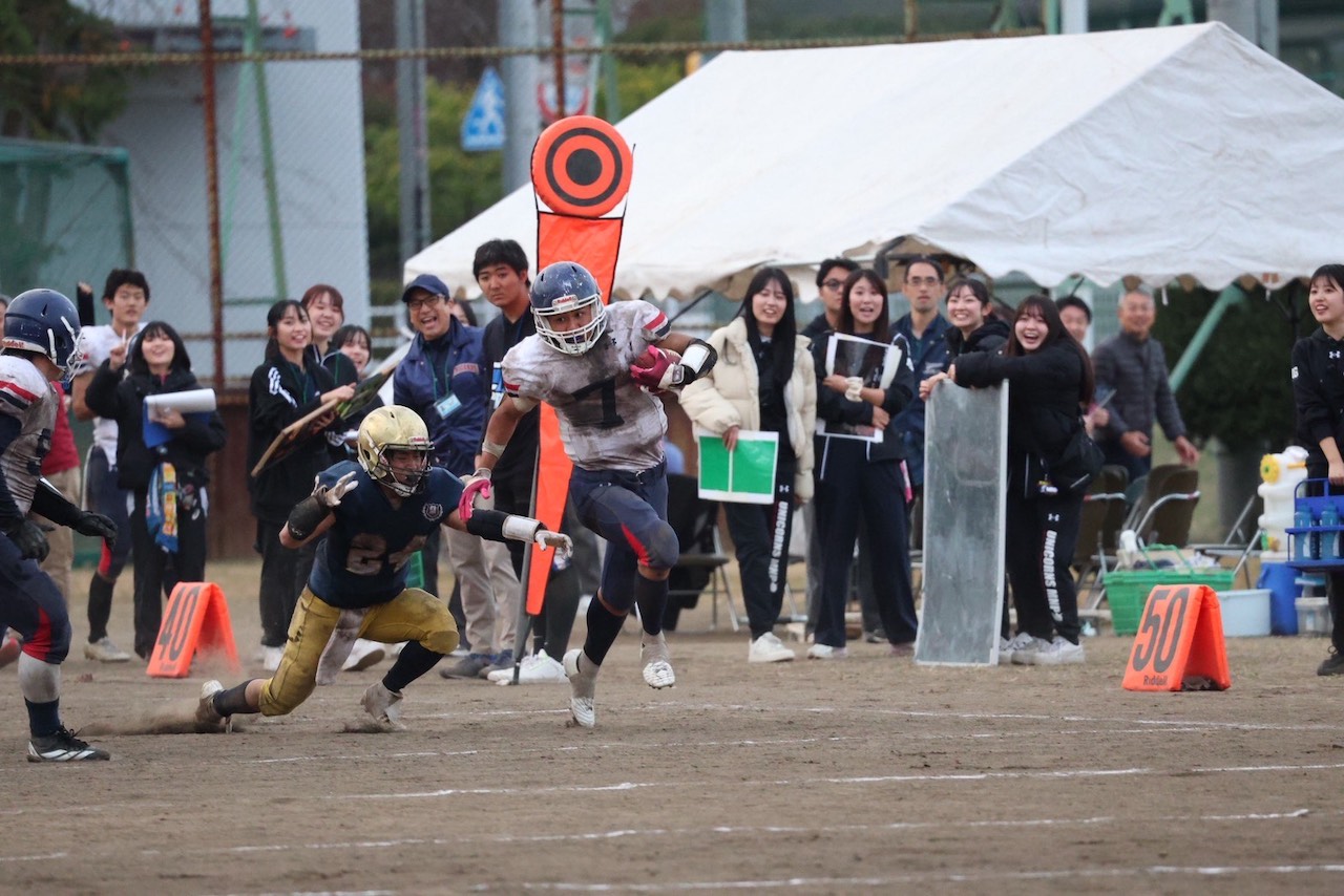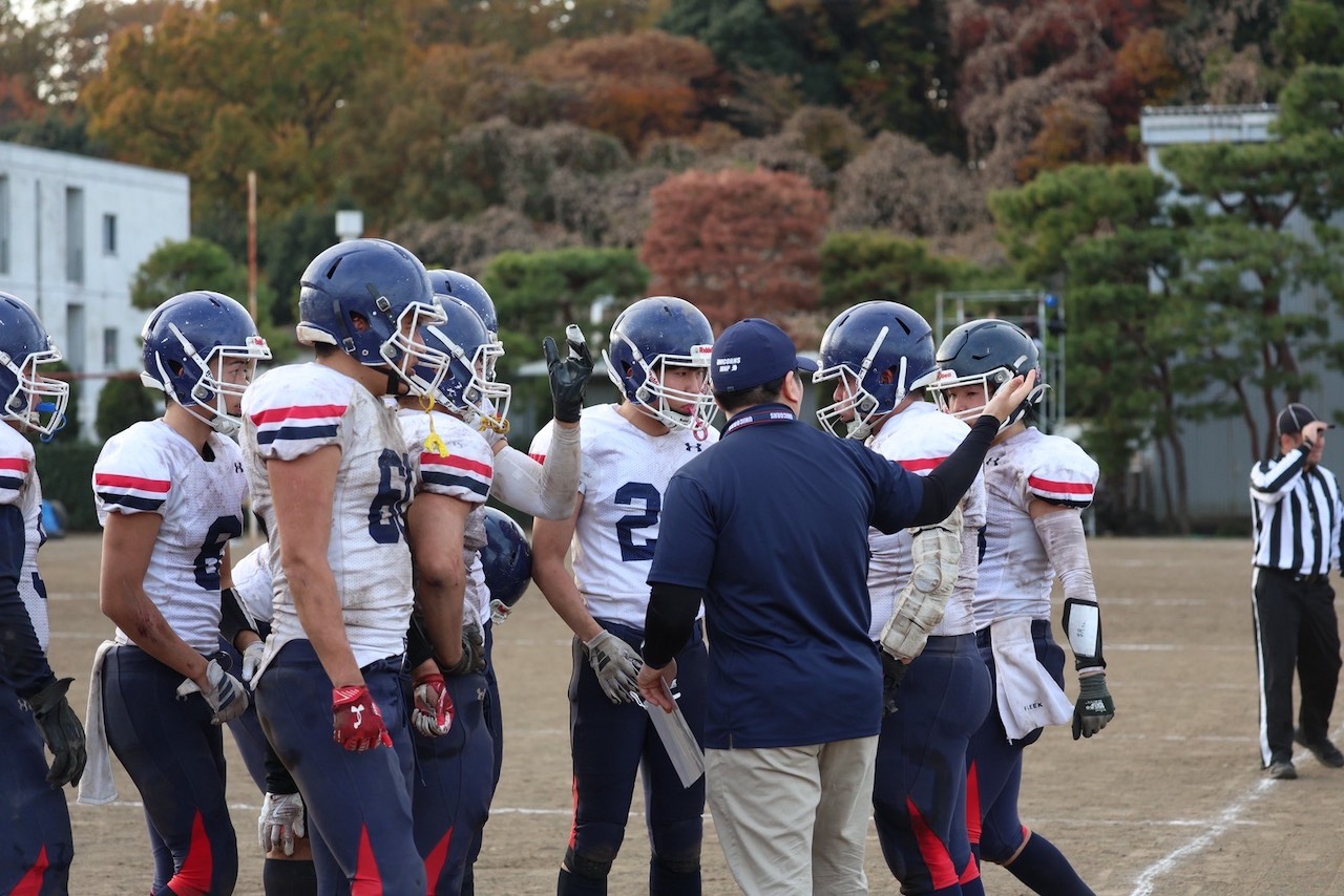 第2Qに入り、慶應はWR#7木村(4年)、WR#11下城(1年)へのパスなどでテンポ良く相手陣深くまで攻め込むと、最後はFB#9張(4年)のdiveでボールを捩じ込みTD。TFPのキックも決め、再び同点に追いついた(慶應14―慈恵14)。続くディフェンスは、今年ラストイヤーのDE#60宮崎(院2)による立て続けのタックルなどにより、慈恵をパントに追い込む。しかし、慶應オフェンスも自陣内でインターセプトを喫してしまい、わずか3プレーで攻撃権は再び慈恵へ。流れが相手に傾きかけたかに見えたが、ここは慶應陣27ydからの攻撃をDL#59浅野(5年)のロスタックルなどでしのぎ切り、同点で前半を折り返した。