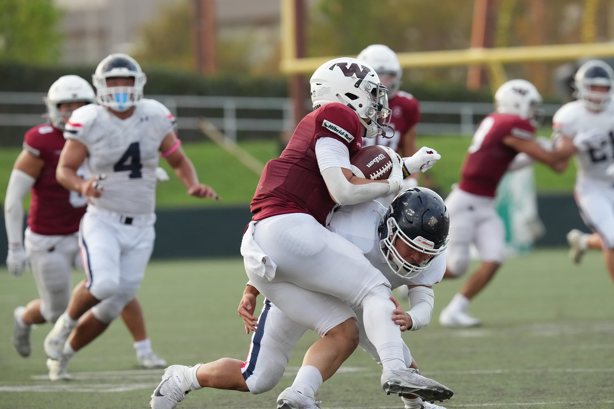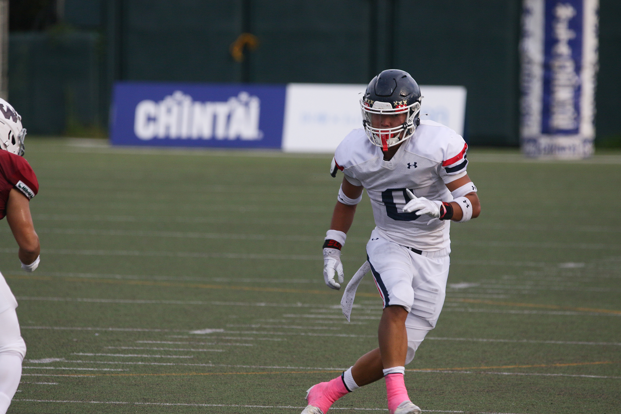 関東最強レベルで、ここ数年、縦横無尽に走られてきた早稲田RBを幾度となくロスタックルでしとめ、また、1発目が外されても2発目、3発目、4発目のタックルが入りロングゲインを許さない。課題であった運動量も素晴らしく、プレー終了時点でUnicornsディフェンダーが何人も集まっているシーンが何度もあった。