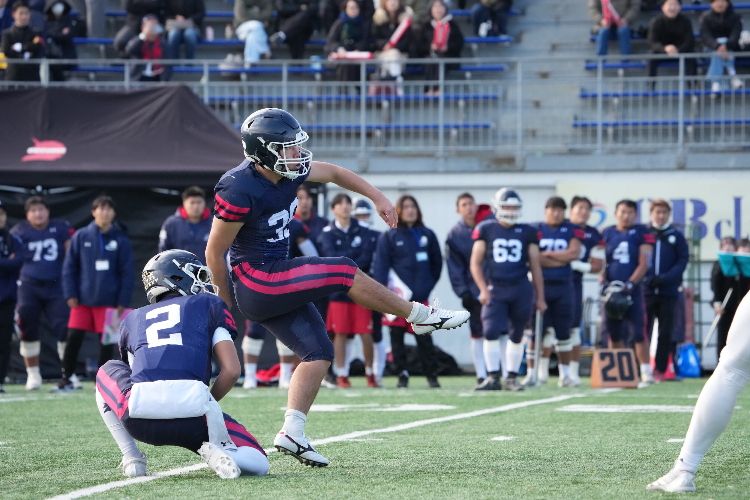 スナッパーを務めたDB登録#30三田(1年・塾高)、 ホルダーを務めたQB#2滝沢(3年・塾高)、そしてキッカー# 39北村。