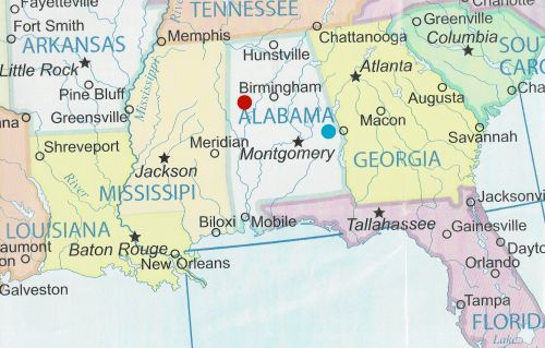 アラバマ州地図。赤丸がアラバマ大のあるタスカルーサ市(人口11万人)、青丸がオーバーン大のあるオーバーン市(8万人) 同じ州内ではありますが、西端と東端に分かれており、クルマで走ると250kmあります。