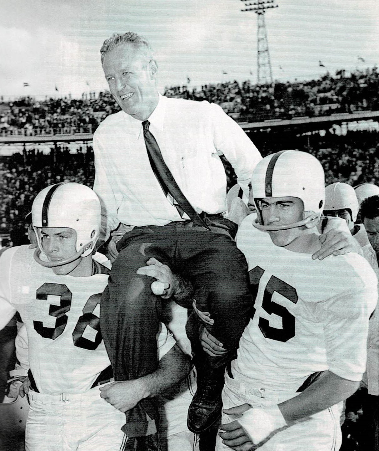 1953年、1敗1分のスタートから盛り返し、9連勝で終わったオレンジボウルの後、選手の肩に担がれるバド・ウイルキンソン  出典:Rites of Autumn, by Richard Whittingham