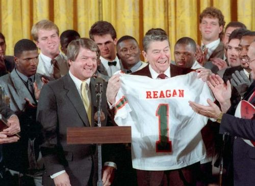 1987年度、全米王座獲得後、マイアミ大選手とともにホワイトハウスを訪れて、ロナルド・レーガン大統領に同校のユニフォームを贈るジミー・ジョンソン・コーチ 出典:Wikipedia